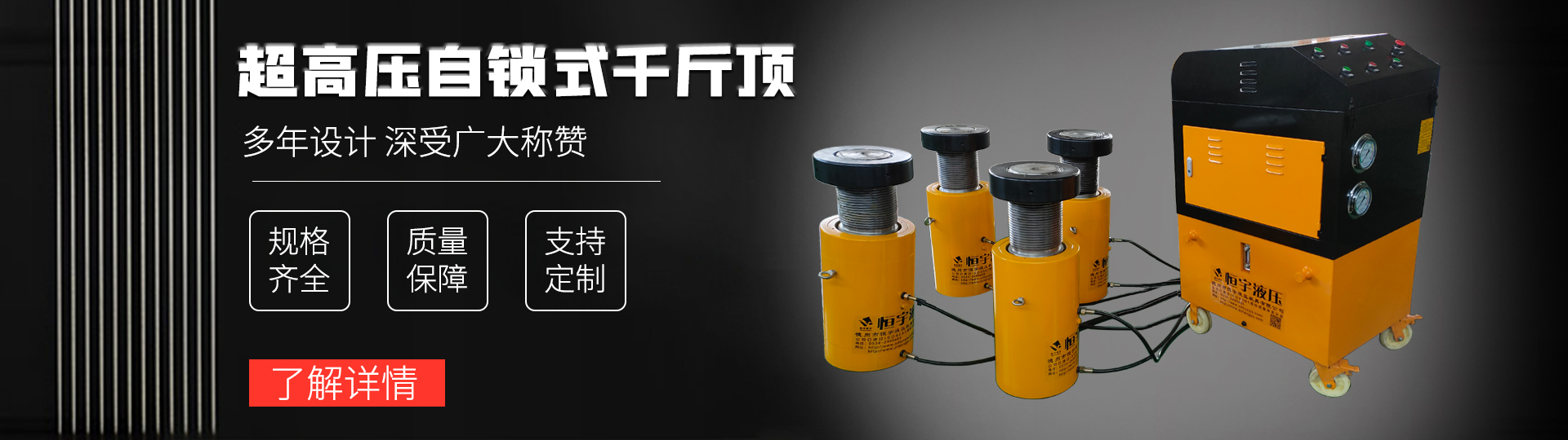 德州市德城區(qū)恒宇液壓機(jī)具有限公司(原德州恒宇液壓機(jī)具廠)是液壓千斤頂、超高壓泵站、超高壓大流量柱塞泵、PLC智能同步頂升系統(tǒng)油缸及整套液壓系統(tǒng)的專業(yè)生產(chǎn)商服務(wù)商,擁有超高壓液壓千斤頂核心生產(chǎn)技術(shù)的生產(chǎn)經(jīng)驗(yàn)和研發(fā)團(tuán)隊(duì)!產(chǎn)品品種涵蓋:液壓千斤頂、頂管機(jī)千斤頂、超高壓手動(dòng)泵、超高壓電動(dòng)泵、液壓中心架、徑向柱塞泵、軸向柱塞泵、成套液壓系統(tǒng)設(shè)備及各種高低壓液壓缸。也可根據(jù)客戶的要求定制液壓系統(tǒng),液壓千斤頂。我公司技術(shù)力量雄厚,千斤頂檢測設(shè)備齊全,產(chǎn)品質(zhì)量穩(wěn)定可靠,售后服務(wù)周到,千斤頂?shù)母黜?xiàng)技術(shù)指標(biāo)均接近或達(dá)到國際水平。恒宇液壓作為高品質(zhì)液壓產(chǎn)品的提供者,不斷創(chuàng)新研···